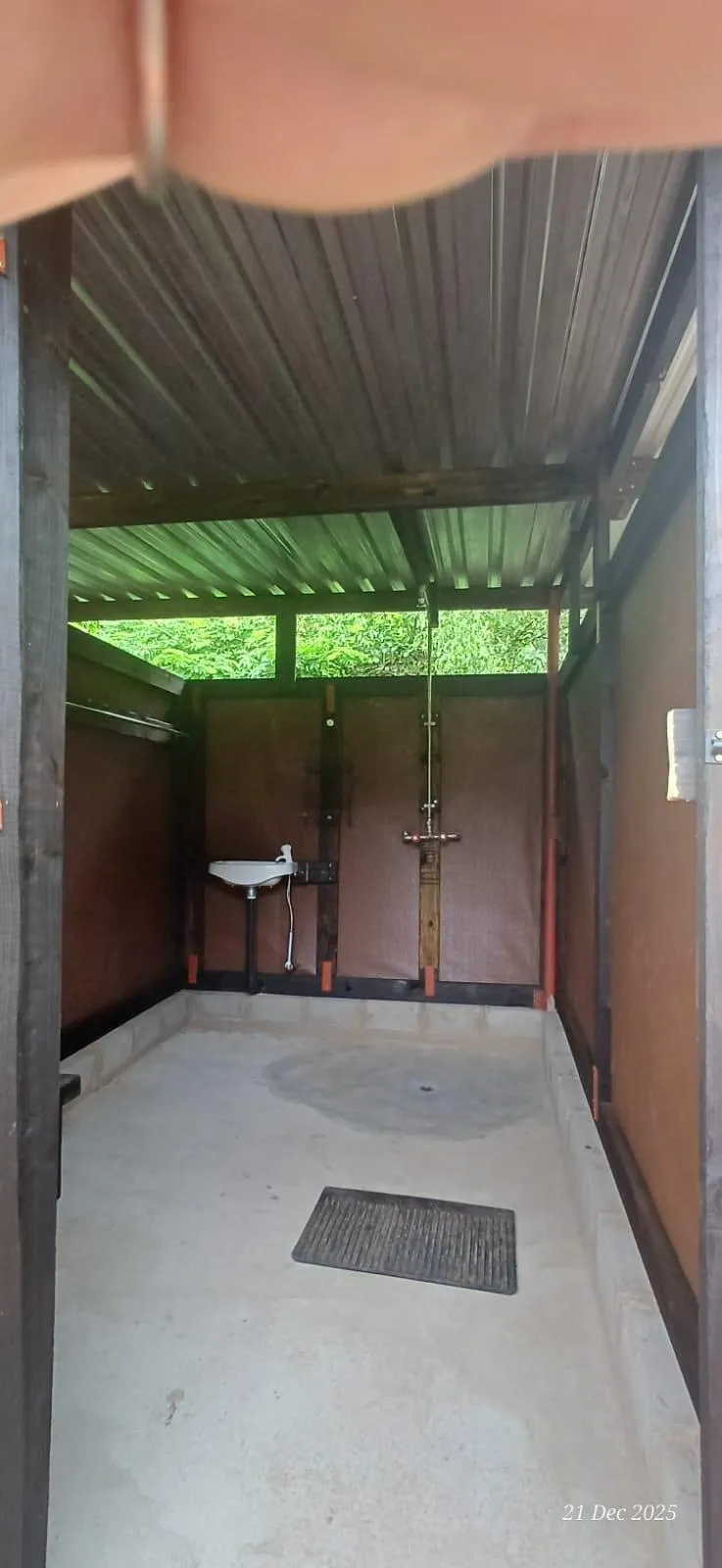 The campsite operates an off-grid donkey boiler system to supply warm water to the bathrooms.